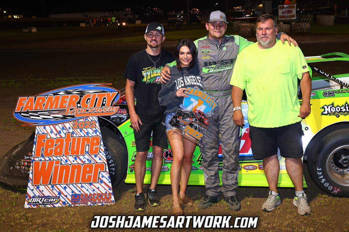 Tyler Erb picked up his fourth victory of the season in thrilling fashion on Friday night at Farmer City Raceway. He used a daring run exiting turn four coming to the checkered flag to pass Ricky Thornton Jr. and claim the $15,000 triumph in the Farmer City 74 presented by Douglas Dodge.